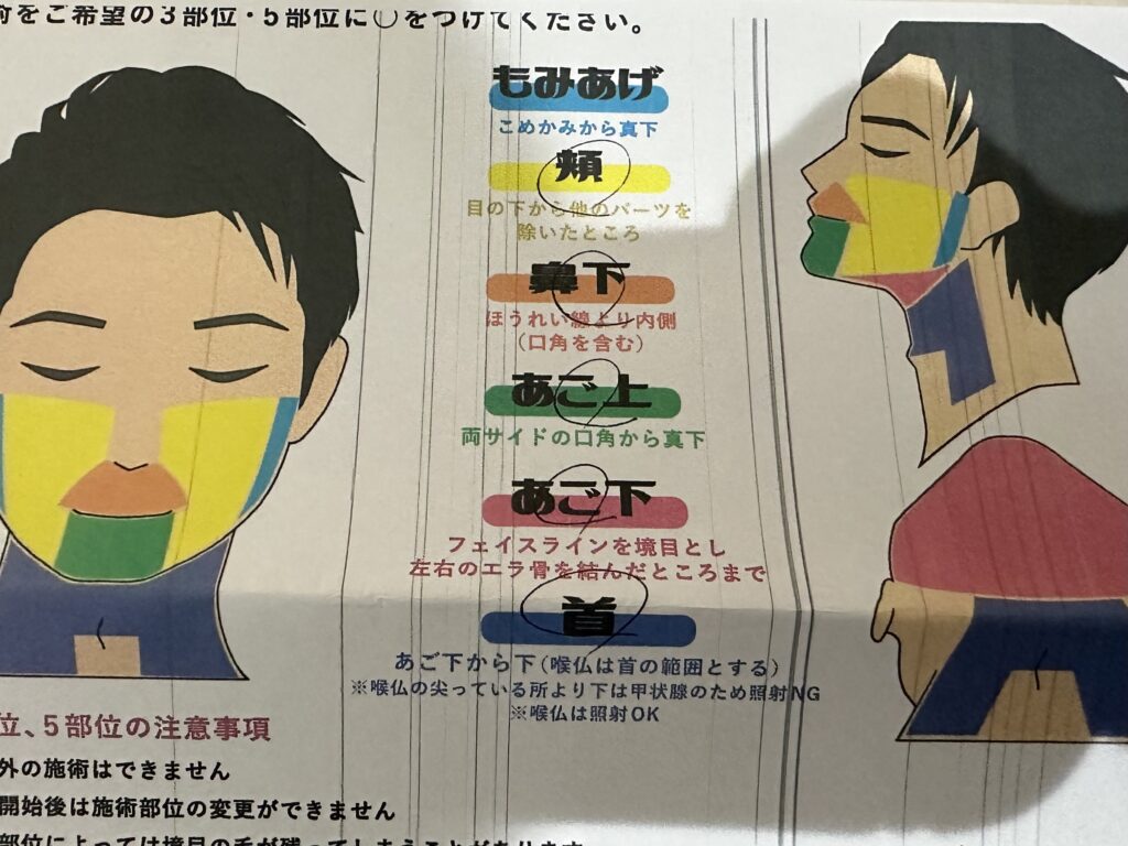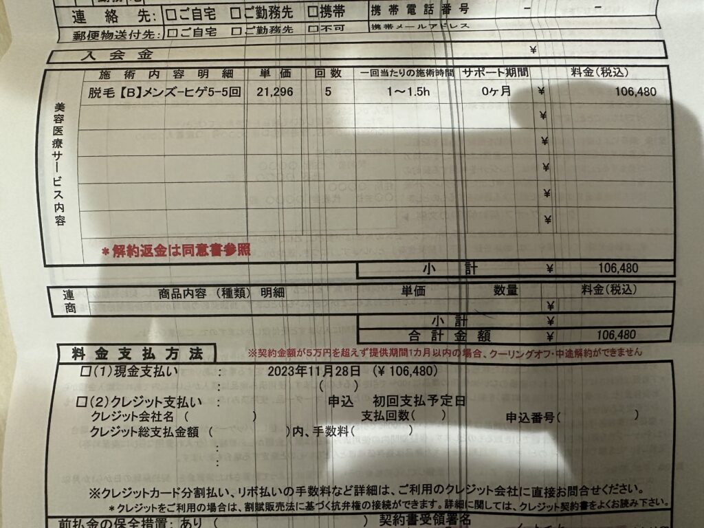 ではここから脱毛の経緯を説明していきたいと思います。僕が契約したのは脱毛5カ所(頬、鼻下、顎上、顎下、首)/5回で金額は税込み106,468円。決して安くはないですね、しかしやって良かったと今でも思っています。