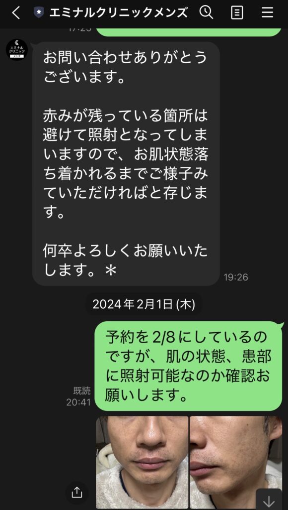 ただその都度、LINEで連絡があり肌の状態を写真で送り施術可能か?判断してもらい予約をしていました。契約中のフォローは非常に良かったです。