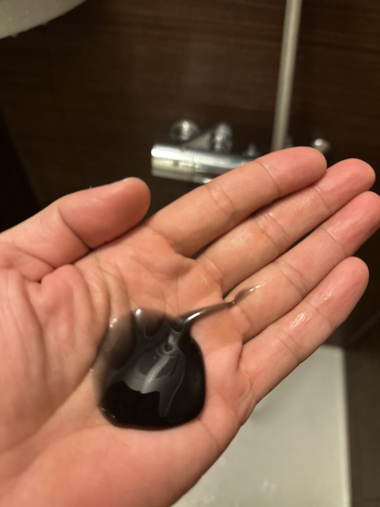 一般的なシャンプーに比べて液体の粘度か高いです。最初は黒かったですが泡立てると白くなります。