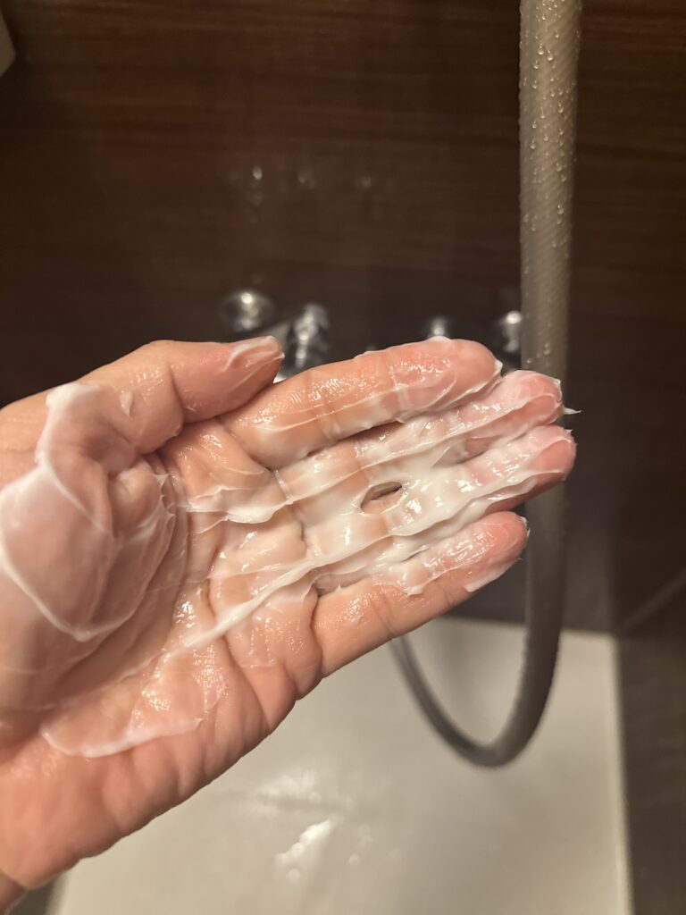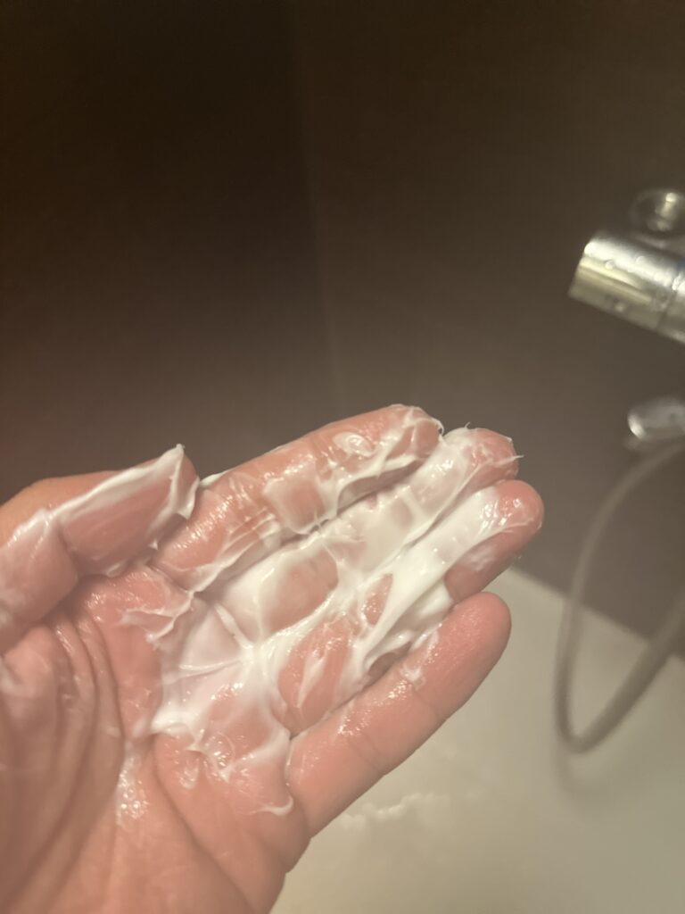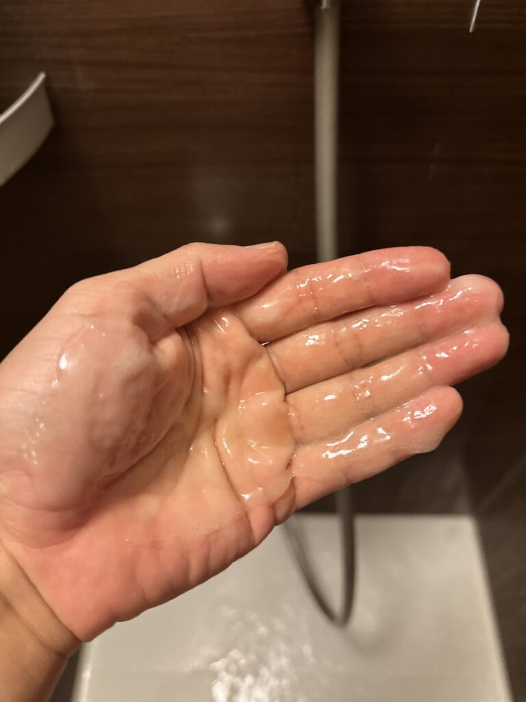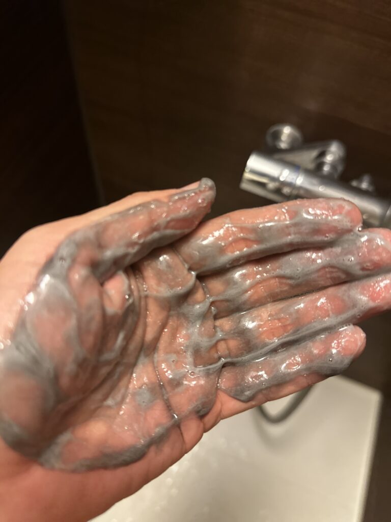 黒と同じく一般的なシャンプーと比べて粘度が高いです。そして匂いが強いです。泡立ちは黒の方が良く感じました。
